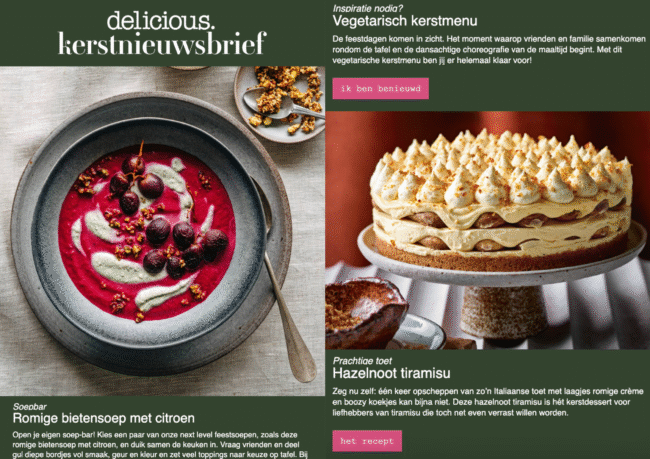 Online coördinator Els van Asseldonk: “Naast onze reguliere nieuwsbrieven (76.000 abonnees) hebben we dit jaar ook een speciale kerstnieuwsbrief in het leven geroepen. Zo voorzien we de diehard kerstliefhebber al vanaf oktober van inspiratie voor de lekkerste tijd van het jaar. In amper 4 weken tijd schreven al 8.000 fans zich in.”