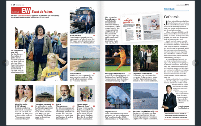 In het zomernummer van 2023 zijn onder meer lange interviews te lezen met eurocommissaris Frans Timmermans (over Rusland, Europa en de mogelijke terugkeer van Donald Trump) en de populaire microbioloog Rosanne Hertzberger – zij vertelt waarom zij zo graag provoceert.